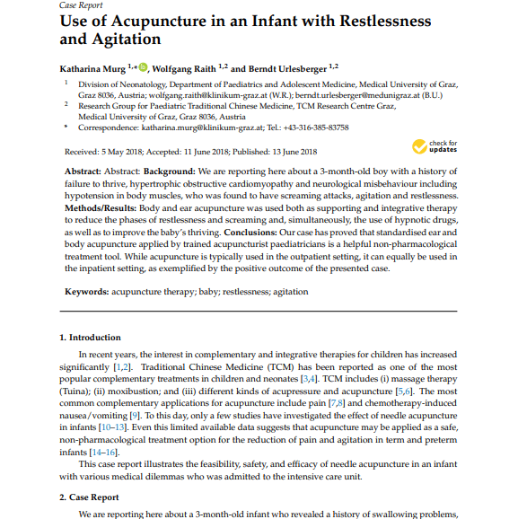 Estudo 1 – Caso clínico: Acupuntura corporal e auricular em um bebê de 3 meses reduziu choro, refluxo e uso de medicamentos, melhorando sono e alimentação (Fonte).