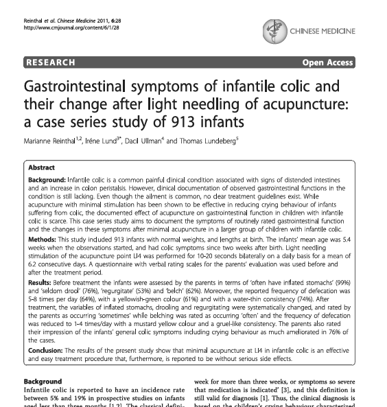 Estudo 2 – 913 bebês: Aplicação no ponto LI4 por 6 dias reduziu cólicas, gases e regurgitação, com melhora relatada por 76% dos pais (Fonte).